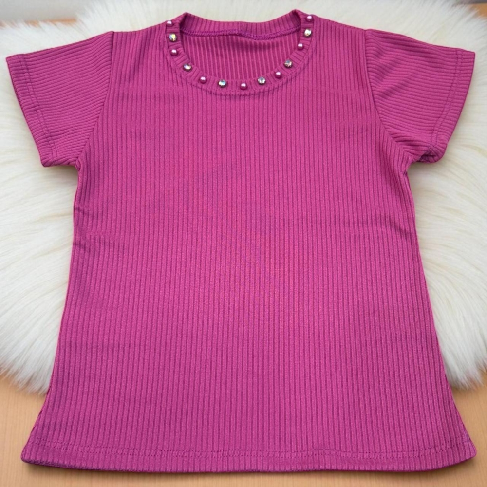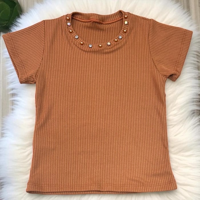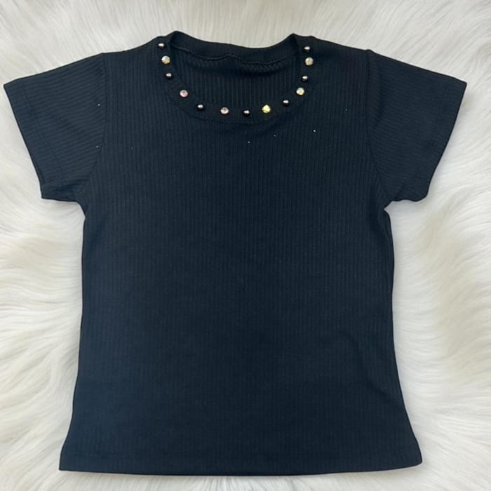 ✅ Detalhe na gola com pedras strass furta-cor e pérolas na cor da peça