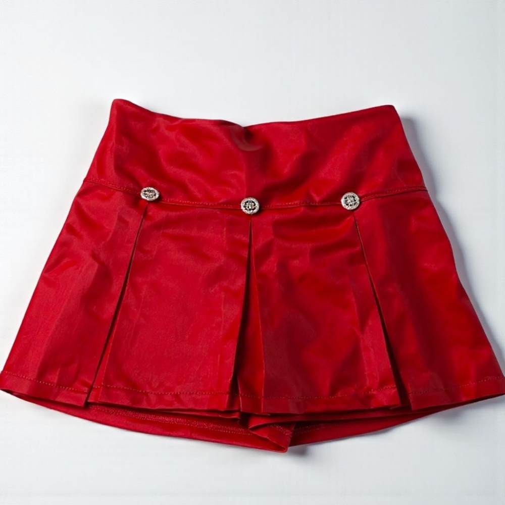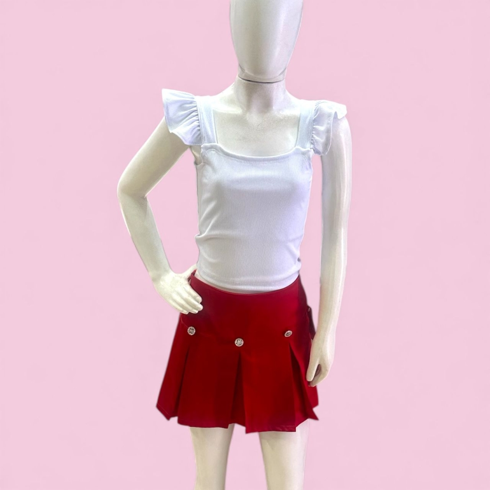 O cós possui elástico na parte de trás, garantindo melhor ajuste e conforto para o dia a dia. Os botões em strass na parte frontal dão o toque final de brilho que as meninas amam.
