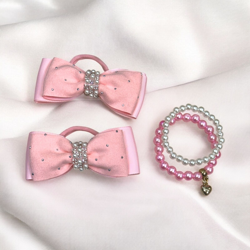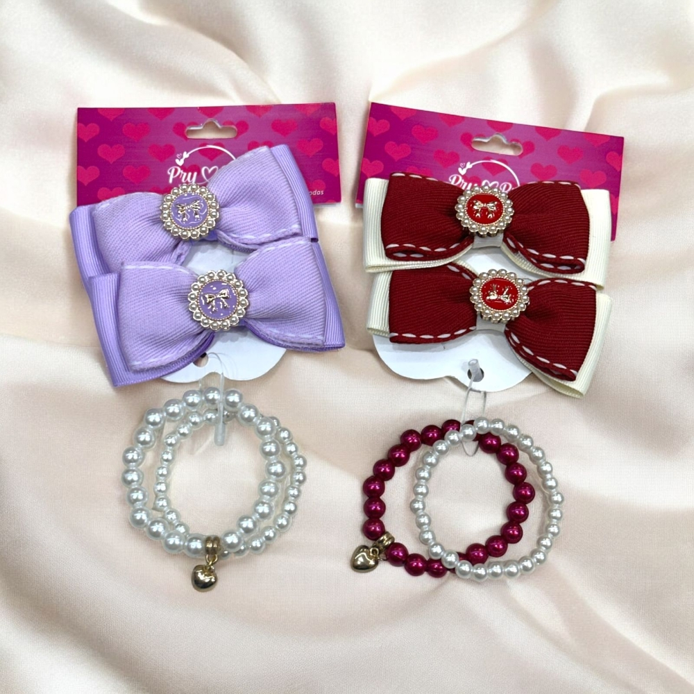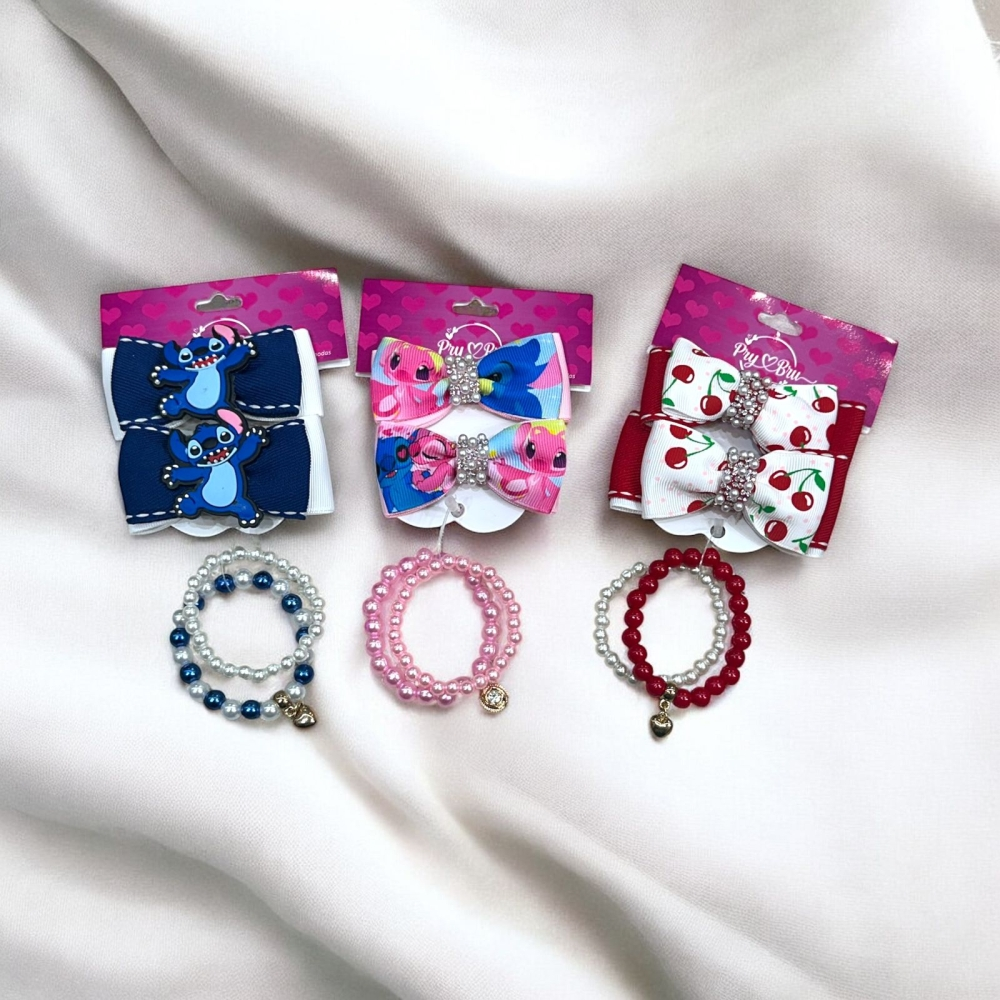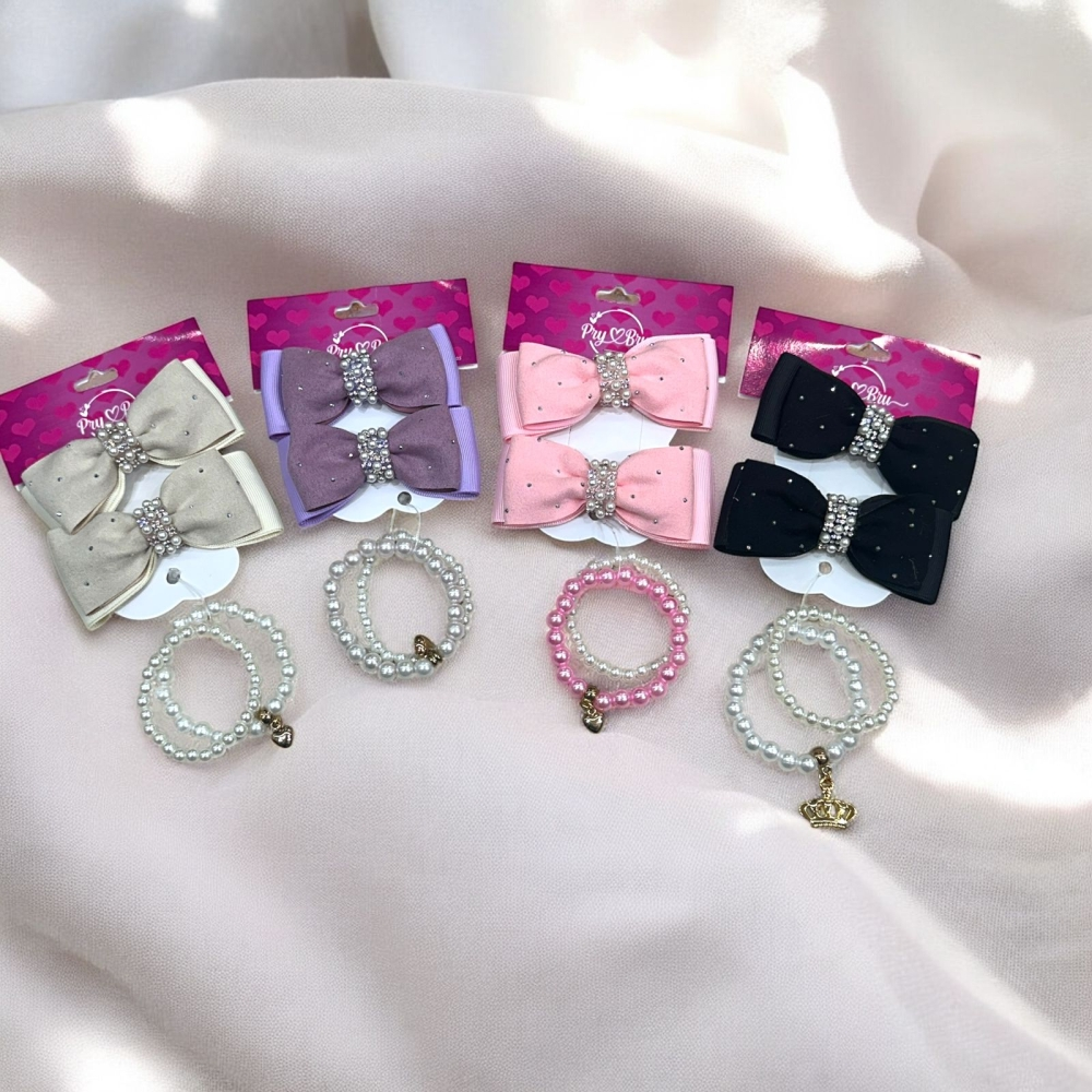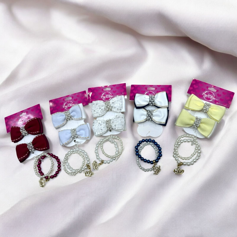 Encante suas clientes com esse kit completo e supervendável! O combo vem com 1 par de laços com xuxinha + 1 pulseira infantil, ideal para dar aquele toque especial nos penteados e looks das pequenas.